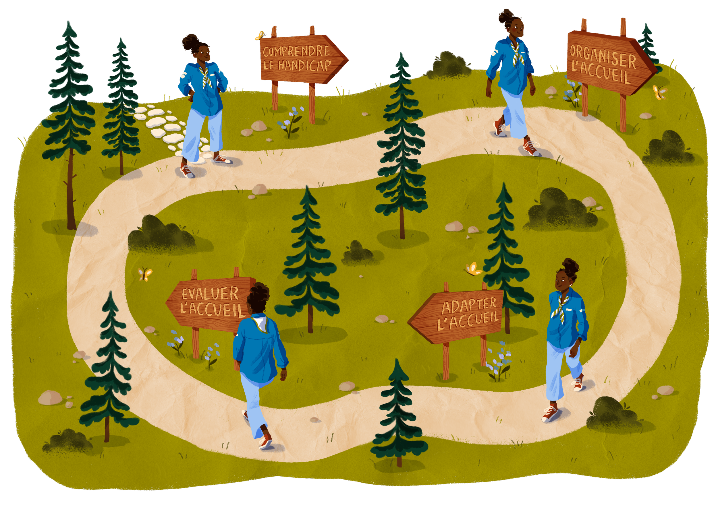 Illustrations d’une formation e-learning à destination des éducateur.ices des Scouts et Guides de France afin d’accueillir au mieux les jeunes en situation de handicap au sein de leurs unités.